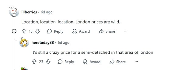 Under the post, titled ‘Semi detached from reality price’ one user said: ‘I dont care how much they’ve done or how much sq m’s they’ve added it’s an ordinary semi house.’