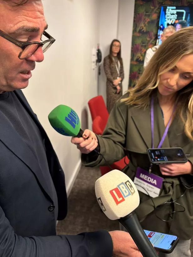 Andy Burnham using the Bee Network app at a press conference to show off LiveChat(Image: Copyright Unknown)