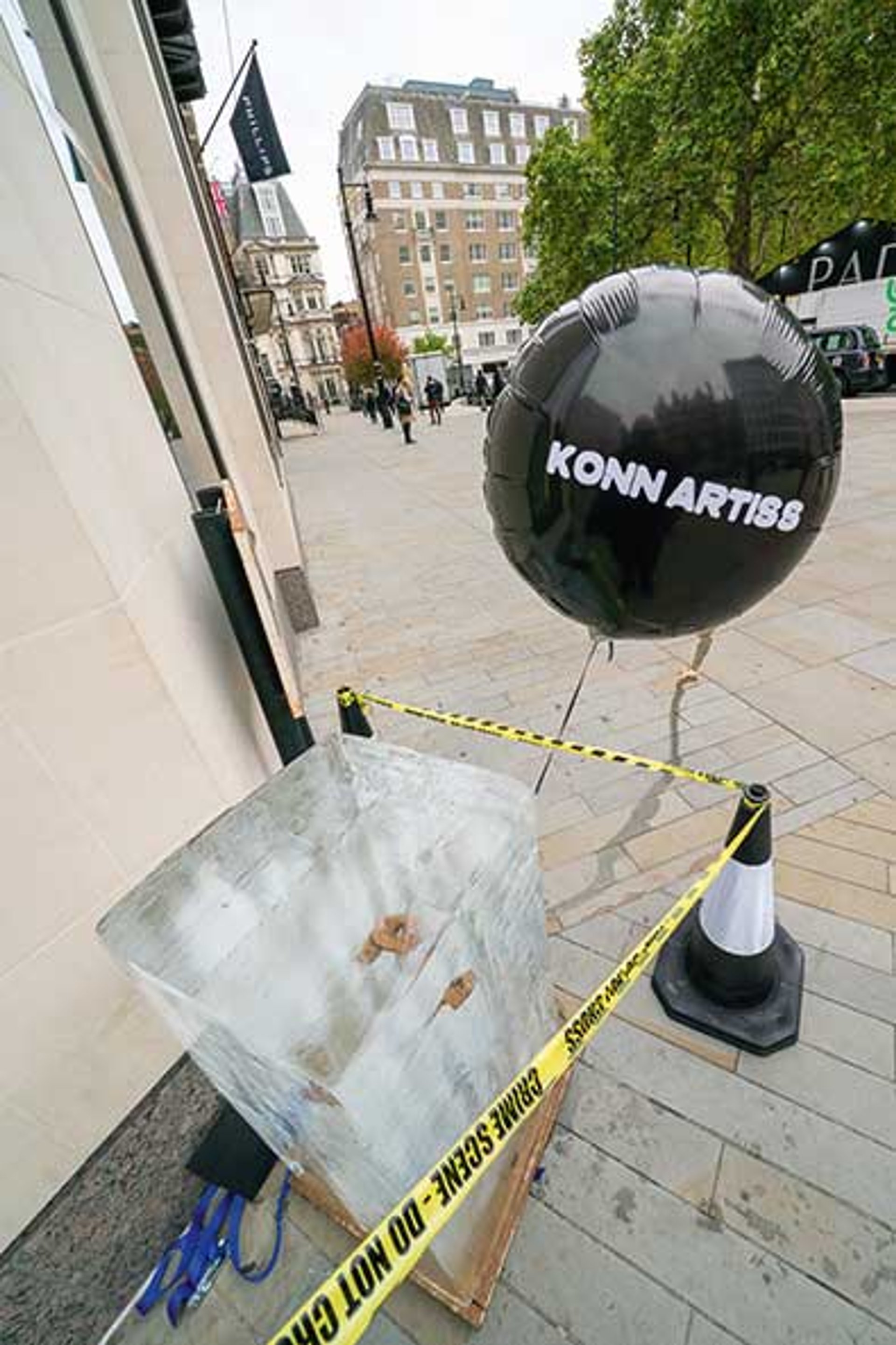 The elusive art collective Konn Artiss caused a stir during Frieze week by placing 40-stone blocks of ice outside London’s major galleries and auction houses. Passersby were surprised to see a framed picture of faeces taped to the window of Phillips auction house this week beside an ice block encasing another “immeasurable piece of poo”, said a project spokesperson. “I froze a block of shit because that’s what the market feels like right now. The frame on the wall is the context; the ice on the pavement is the reality. Make of it what you want,” Konn Artiss says. “As the ice melts, what remains is residue, puddles, curiosity, and a city that can’t look away”. Konn Artiss also placed ice blocks outside Frieze London that contained effigies of famous artists such as Damien Hirst.