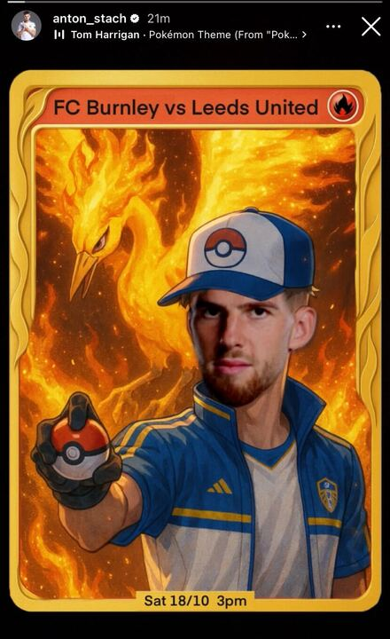 Stach can be seen wearing a Pokemon trainer outfit, but with the Leeds branding. He has selected a fire type as the aspect for the Burnley vs Leeds clash.