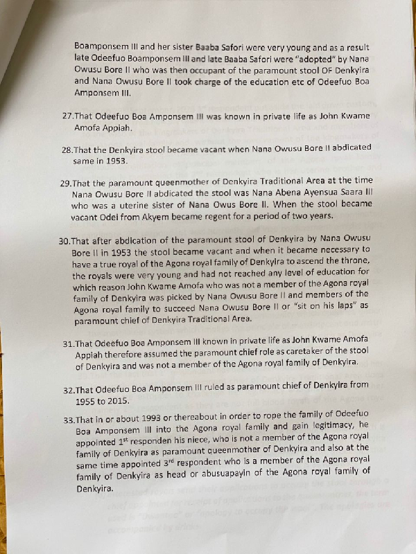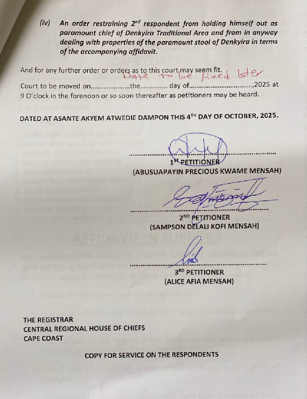 The petition outlines that the Paramount Stool of Denkyira became vacant in 2015 upon the death of Odeefuo Boa Amponsem III.