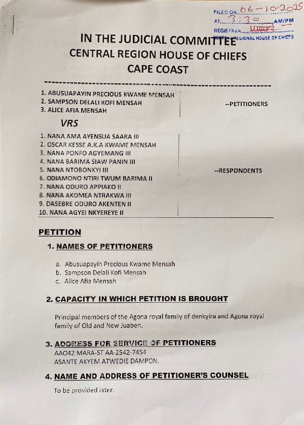 The petition, filed by Abusuapanyin Precious Kwame Mensah, Sampson Delali Mensah, and Alice Afia Mensah, alleges that Oscar Kesse is not a member of the Agona royal family and, therefore, is not eligible for nomination and installation as chief.