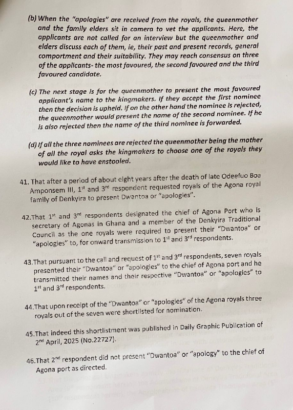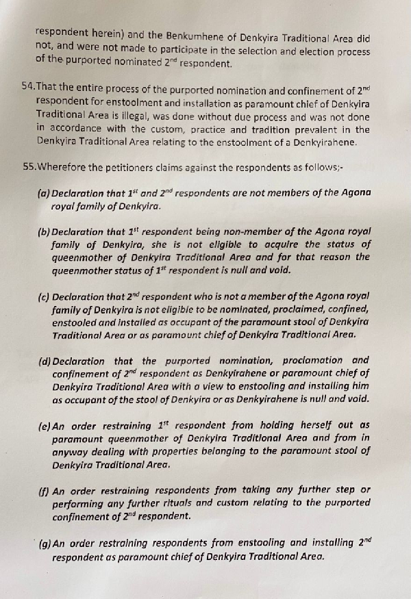 The petition further alleges that the Queenmother of the Denkyira Traditional Council, Nana Ama Ayensua Sara III, nominated Oscar Kesse despite his not having appeared before a vetting committee. It also states that principal kingmakers were allegedly excluded from the selection process.