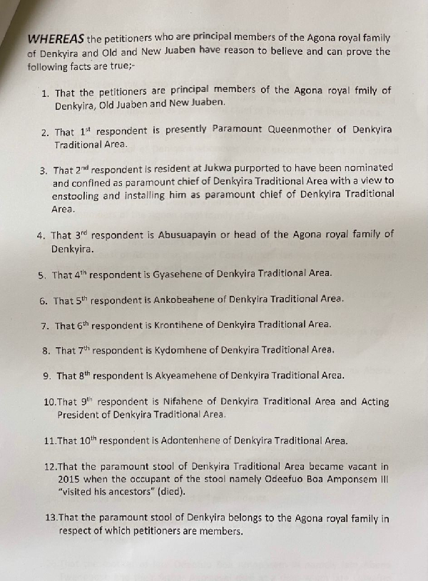 Members of the Agona royal family of Denkyira, Old Juabeng, and New Juabeng filed the petition