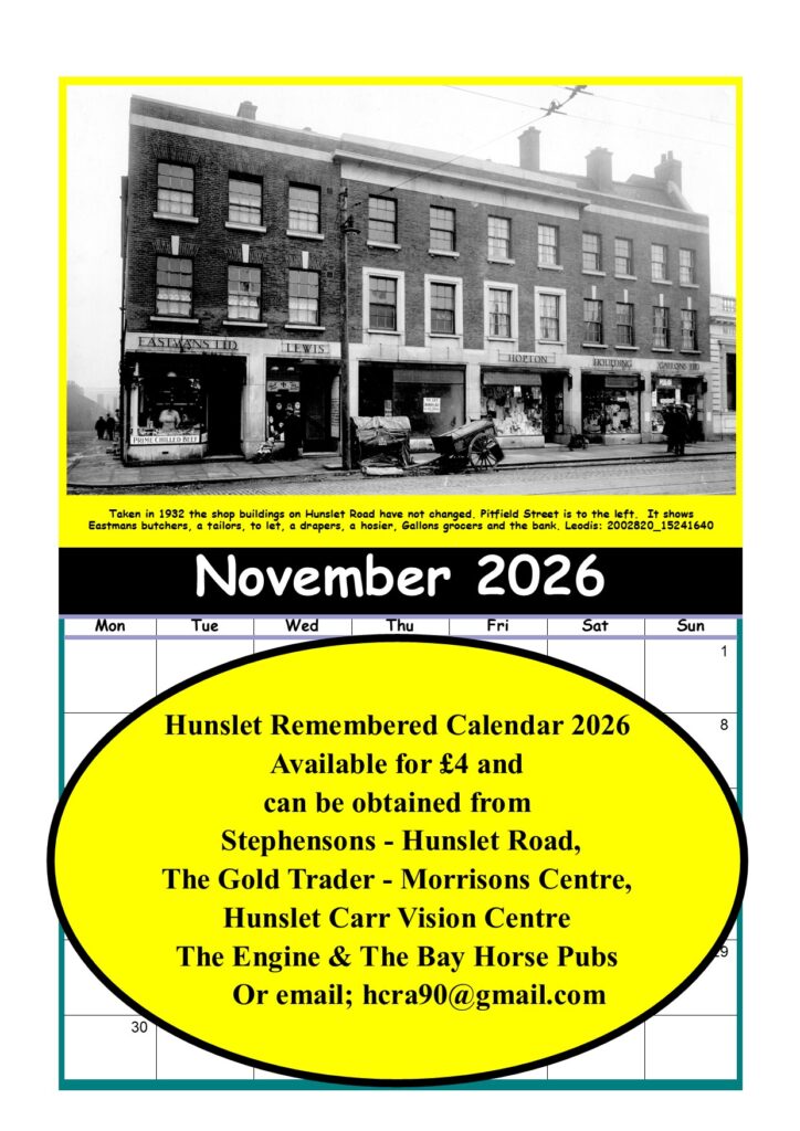 Hunslet Carr Residents Association have once again produced their popular Hunslet Remembered calendar. As usual the calendar for 2026 features pictures of Hunslet in days gone by.