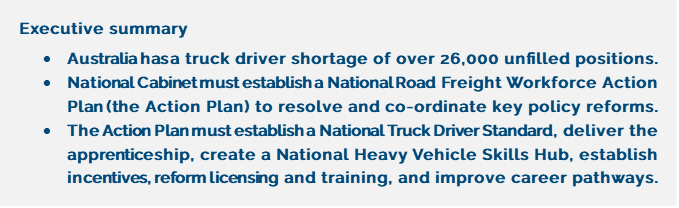 In 2024 Industry Skills Australia (ISA) delivered a Workforce Plan for Transport and Logistics which identified key focus areas and recommendations. Several immediate priorities and actions are yet to occur to address truck driver shortages and are identified as priorities in the 2025 plan1, as such it is recommended any additional resources identified by ISA should be allocated.