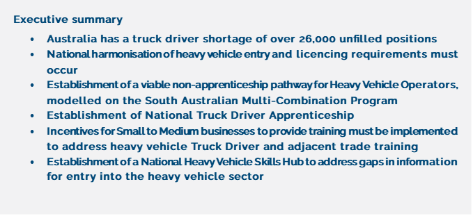 This example of a non-apprenticeship pathway would greatly assist in skilling up drivers to meet Australia’s growing demand and increasing shortfall in suitably skilled and qualified heavy vehicle drivers. All states and territories should adopt the South Australian approach, and consideration should be given to other classifications heavy vehicle licences. Competency based training can also address age restrictions and limitations placed on young people wanting to enter the heavy vehicle industry.