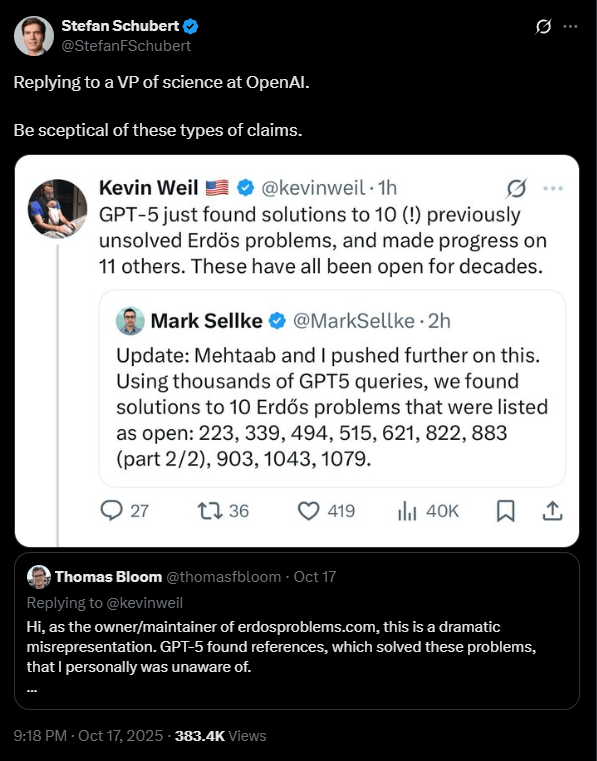 Weil claimed GPT-5 solved classic Erdős problems, but the claim quickly unraveled. | Image: via Stefan Schubert