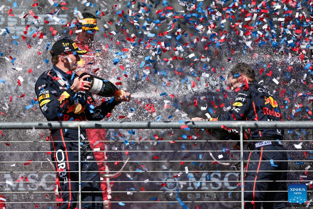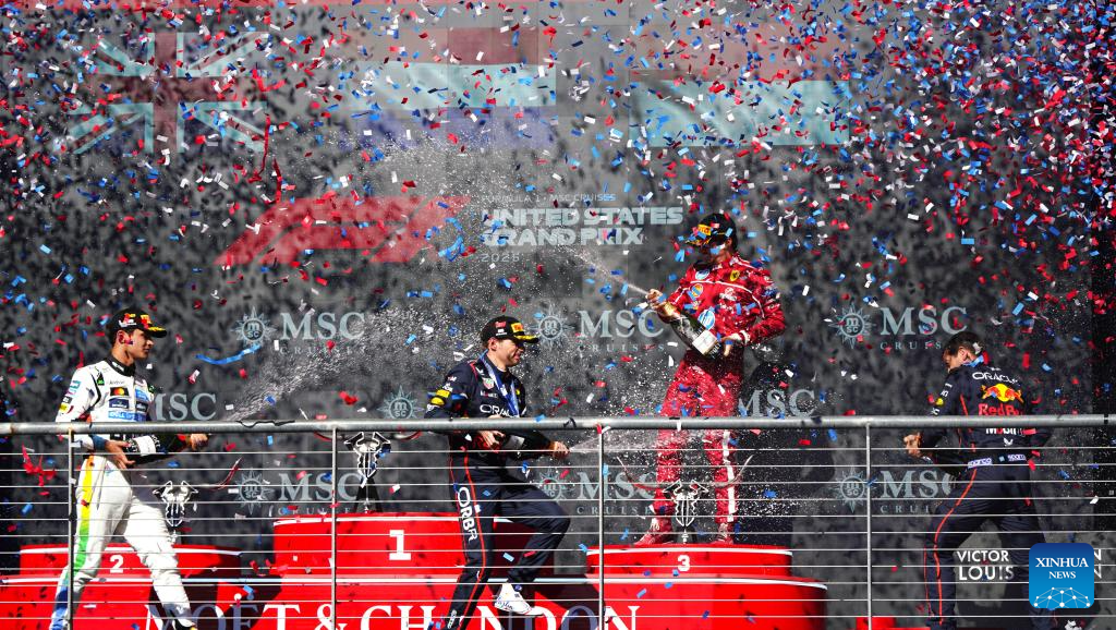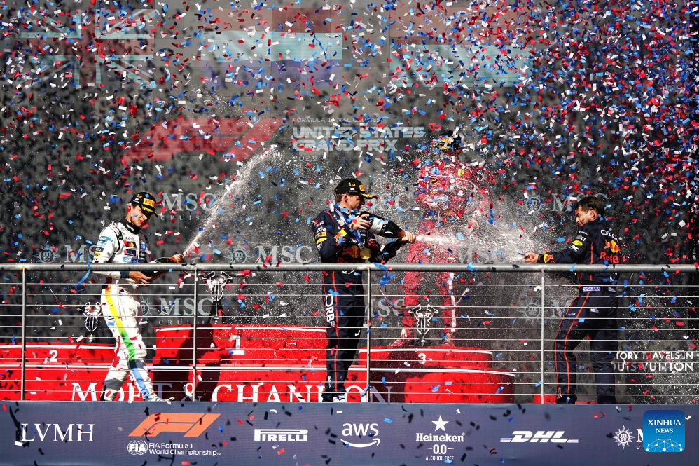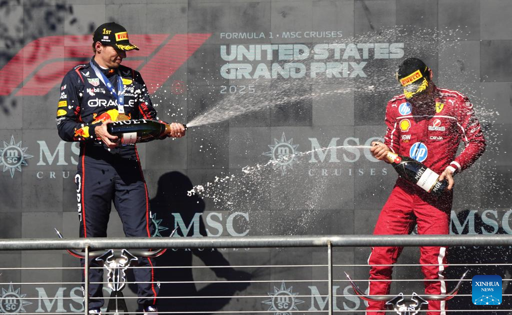 Winner Red Bull’s Dutch driver Max Verstappen (L) and third placed Ferrari’s Monegasque driver Charles Leclerc celebrate during the awarding ceremony after the race of the 2025 Formula One United States Grand Prix in Austin, Texas, the United States, Oct. 19, 2025. (Xinhua/Wu Xiaoling)