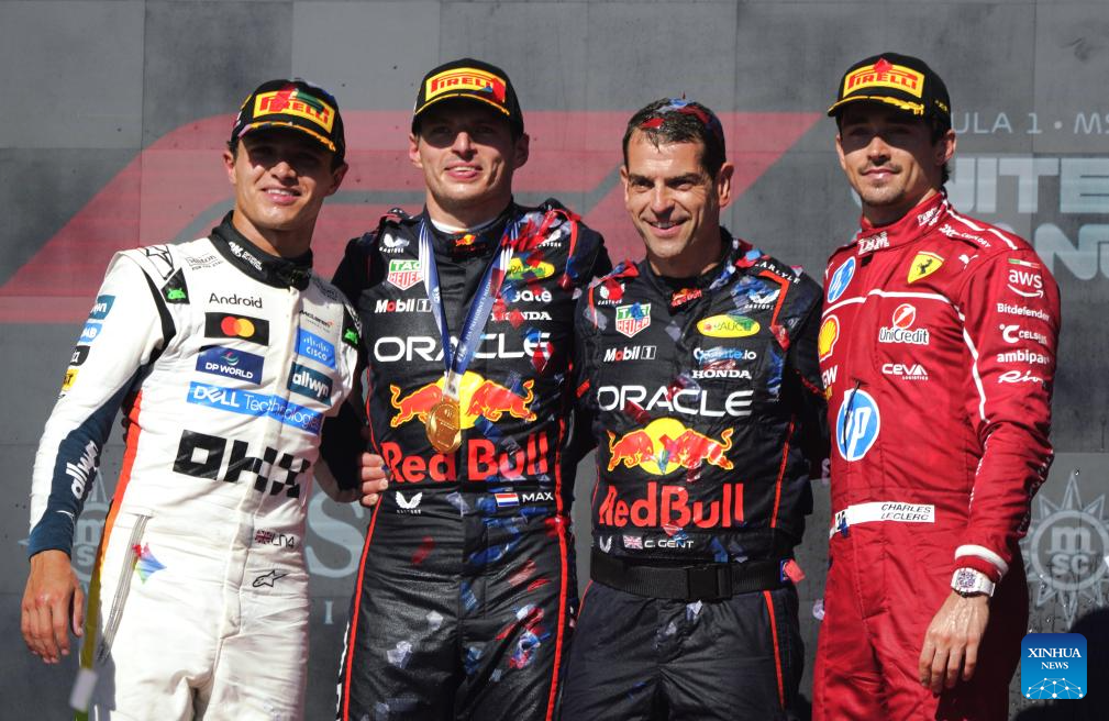 Winner Red Bull’s Dutch driver Max Verstappen (2nd L), second placed McLaren’s British driver Lando Norris (1st L) and third placed Ferrari’s Monegasque driver Charles Leclerc (1st R) pose during the awarding ceremony after the race of the 2025 Formula One United States Grand Prix in Austin, Texas, the United States, Oct. 19, 2025. (Xinhua/Wu Xiaoling)