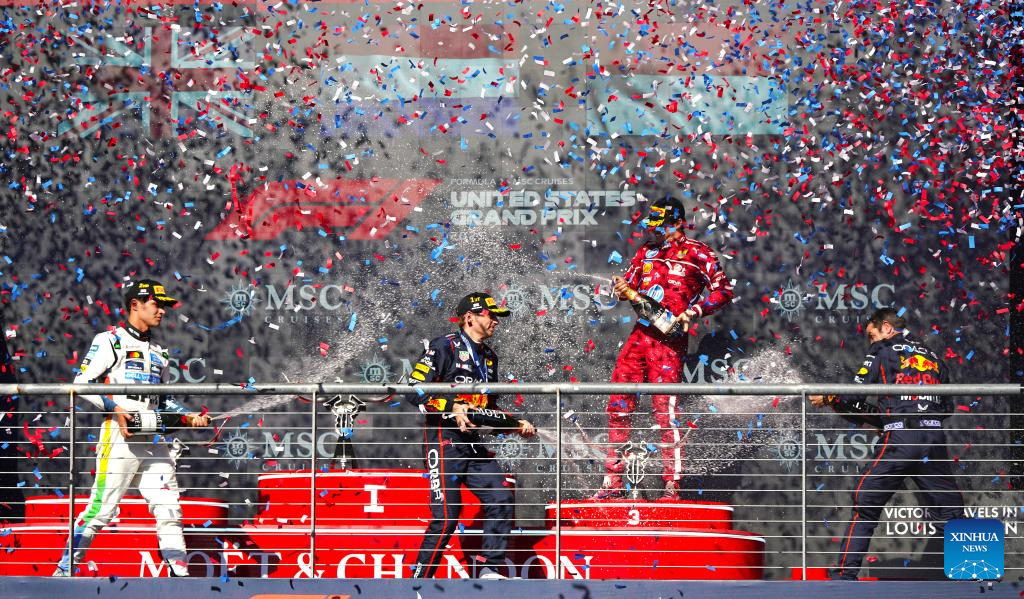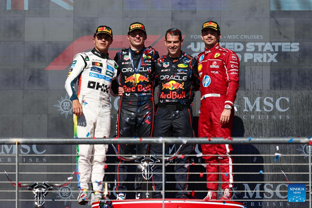 Winner Red Bull’s Dutch driver Max Verstappen (2nd L), second placed McLaren’s British driver Lando Norris (1st L) and third placed Ferrari’s Monegasque driver Charles Leclerc (2nd R) celebrate during the awarding ceremony after the race of the 2025 Formula One United States Grand Prix in Austin, Texas, the United States, Oct. 19, 2025. (Xinhua/Wu Xiaoling)