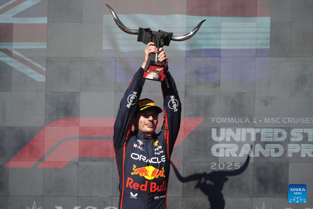 Winner Red Bull’s Dutch driver Max Verstappen celebrates during the awarding ceremony after the race of the 2025 Formula One United States Grand Prix in Austin, Texas, the United States, Oct. 19, 2025. (Xinhua/Wu Xiaoling)