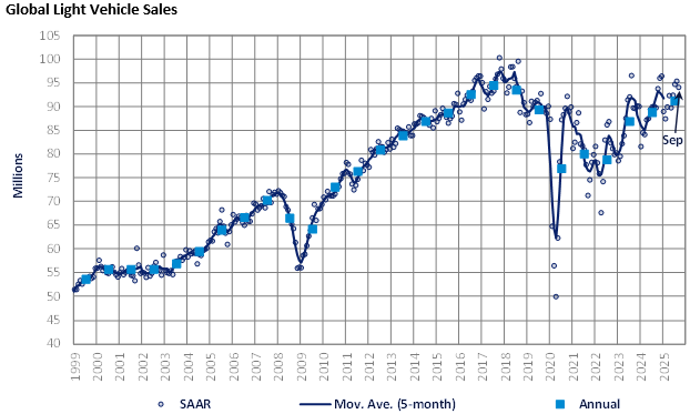 In Eastern Europe, the LV selling rate for September was 4.9 million units/year, continuing the growth seen in August. The Russian LV market fell 12% YoY in September, compared to -18% YoY in the first nine months of 2025. Sales this year have been undermined by the country’s high base rate and increases to the vehicle recycling fee, which have squeezed auto financing and reduced foreign car imports respectively. The Turkish PV market grew for a sixth consecutive month as sales were up nearly 27% YoY in September, totaling 88k units.