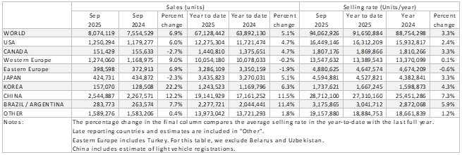 For September, the Global Light Vehicle (LV) selling rate remained broadly in line with July and August, standing at 94 million units/year. In year-on-year (YoY) terms, the market grew 7% as sales reached 8.1 million units globally. Year-to-date (YTD), 67 million vehicles have been sold, up 5% from the same period in 2024.