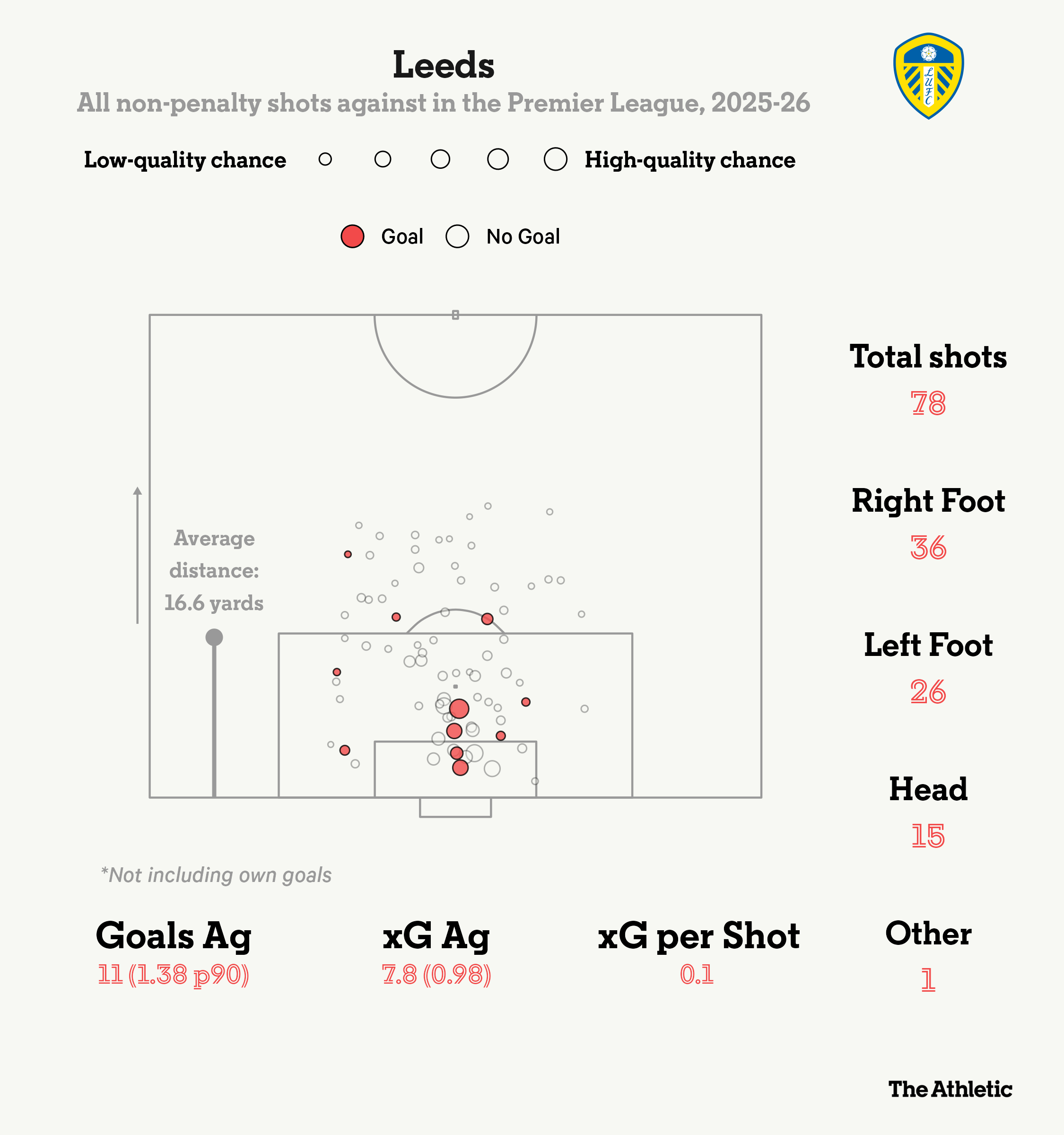 Opponents trying to break Leeds down have generated a non-penalty expected goal (npxG) tally of 7.6. Only three teams (Arsenal, Newcastle United and Manchester City) have performed better in limiting opposition attacks.