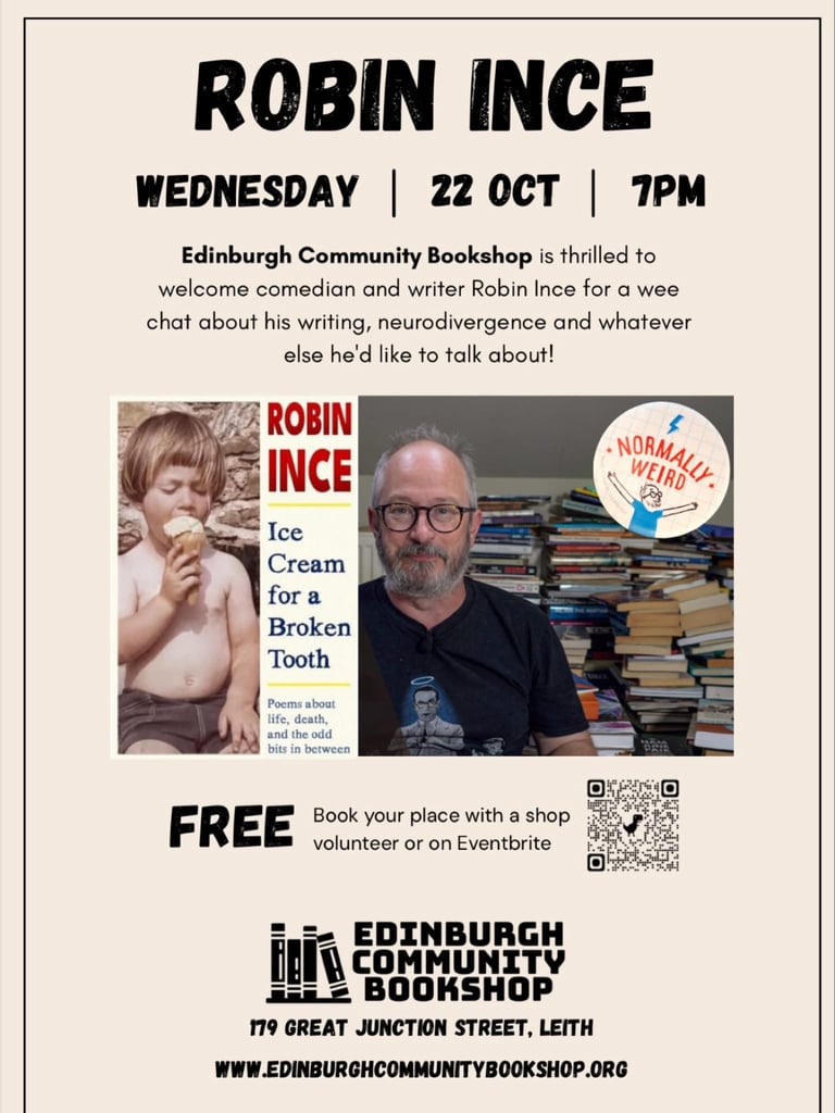 Comedian Robin Ince will be chatting about writing and stuff this evening at Edinburgh Community Bookshop on Great Junction Street in Leith.