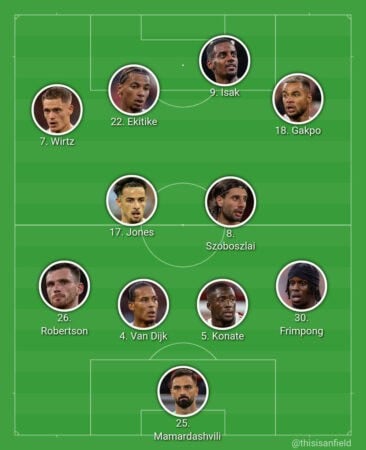 Liverpool: Mamardashvili; Frimpong, Konate, Van Dijk, Robertson; Jones, Szoboszlai; Gakpo, Wirtz, Ekitike; Isak