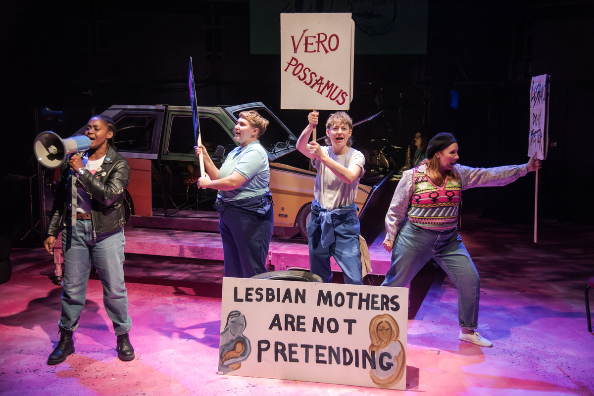 This is the workplace of four female mechanics: maternally-inclined Bev (Nancy Brabin-Platt), her activist lover Terry (Sia Kiwa), no-nonsense garage owner Carol (Eva Scott), and gauche, eager-to-learn apprentice Dipstick (the consistently winsome Lucy Mackay). Quickly setting the scene, they paint a picture of life in the Margaret Thatcher era: the Miners’ Strike, civil unrest, unemployment, food parcels and the Enterprise Allowance Scheme.
