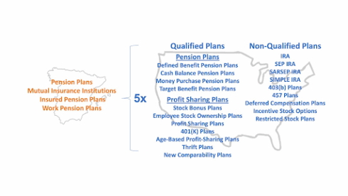 First, there are qualified plans and non-qualified plans. Within the qualified plan category, there are both Pension plans and Profit-sharing plans, that are further divided into defined contribution plans and defined benefit plans.