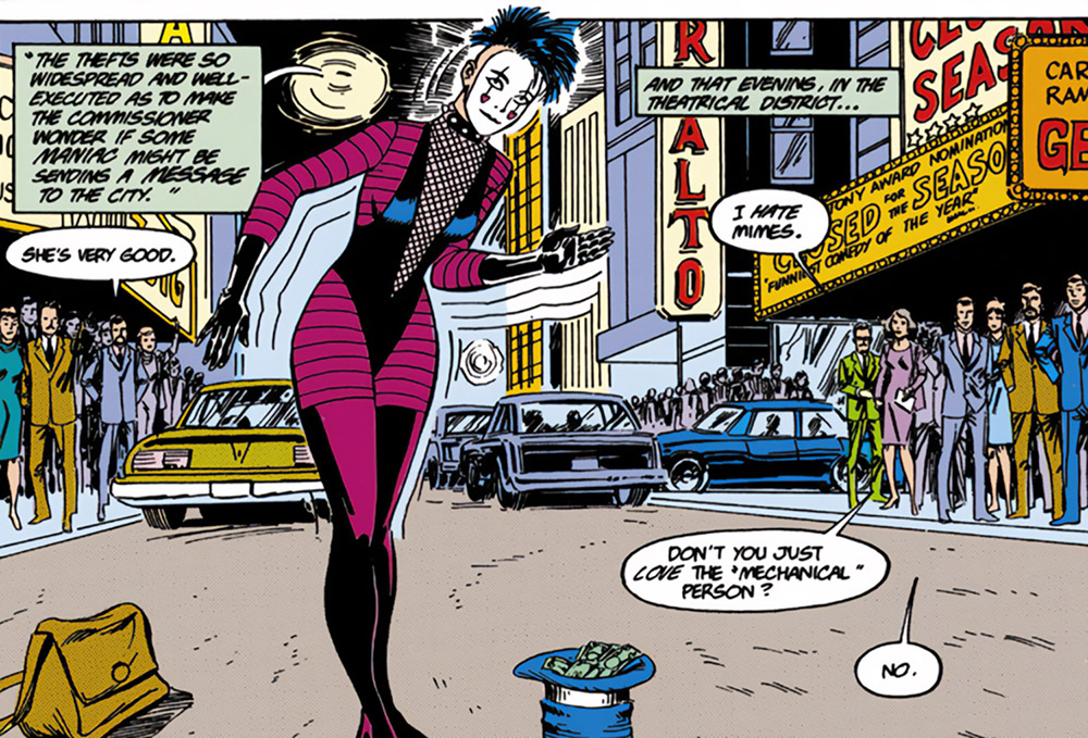 The obvious idea would be to make her a serial killer since that’s the default for reinventions, but honestly, go for a stronger form of thievery. Maybe have her as a rival to Catwoman, pulling off heists without making a peep for profit and going around that way. Also, is it just me, or does she vaguely look like Joker’s new acolyte, Punchline?
