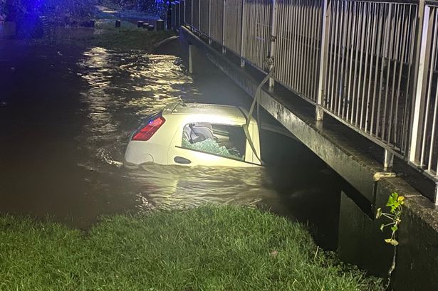 The car was washed downstream and became wedged under a bridge on Green Road, Hall Green, Birmingham.