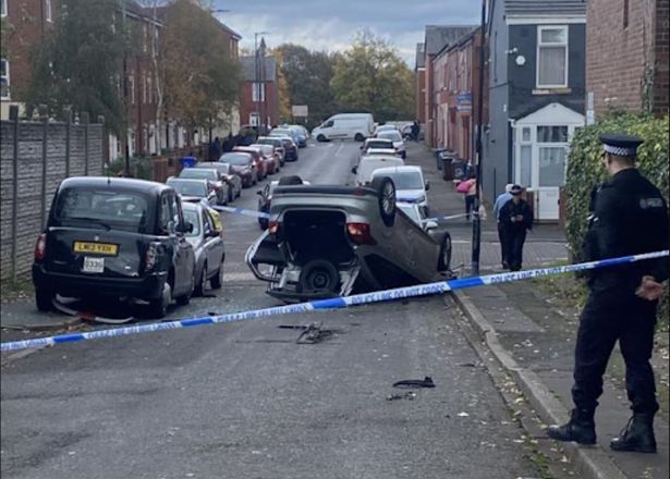 A photograph was earlier sent to the Manchester Evening News, showing a car on its roof at the scene. The boot and what appears to be a door are seen open.