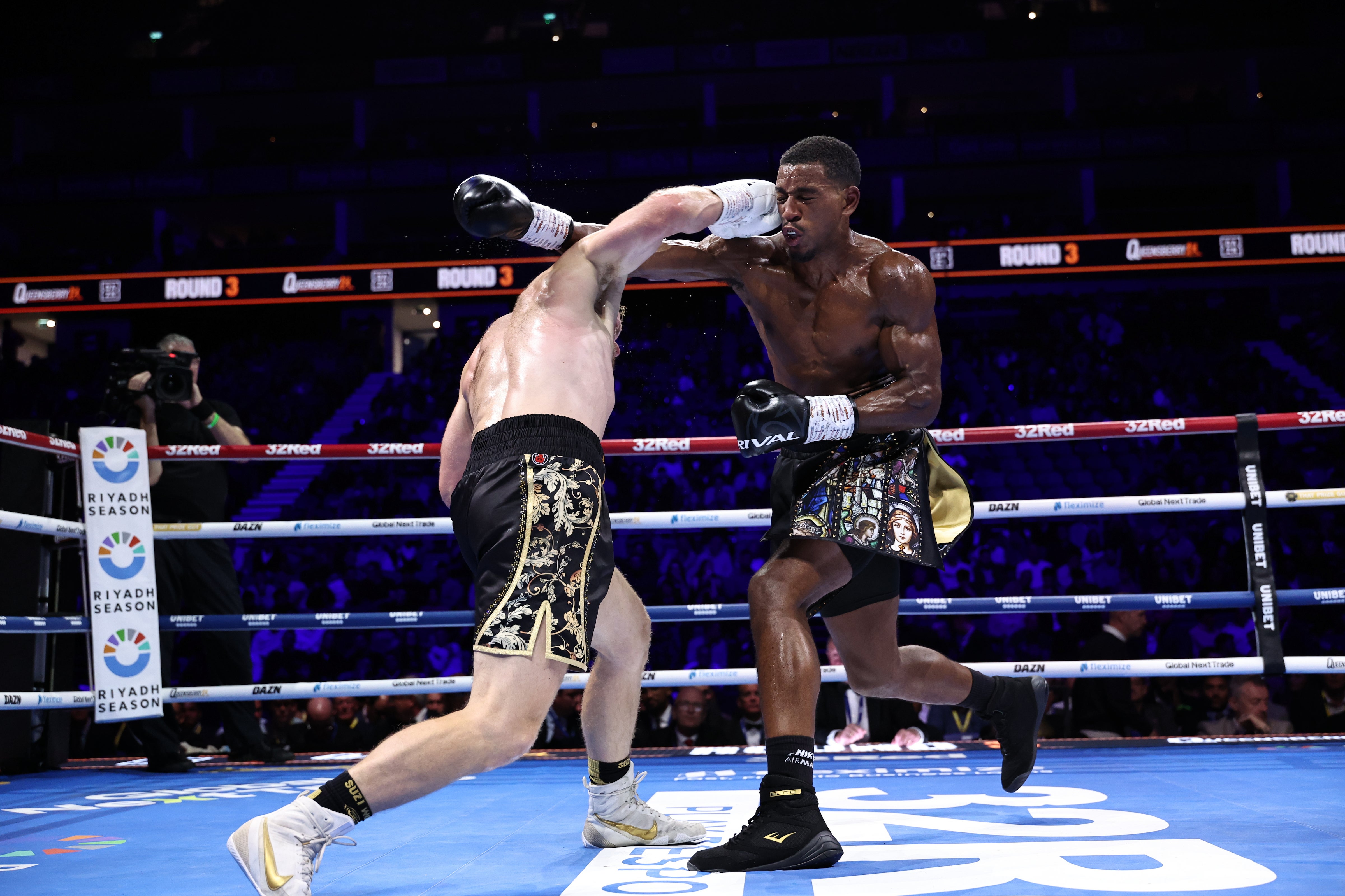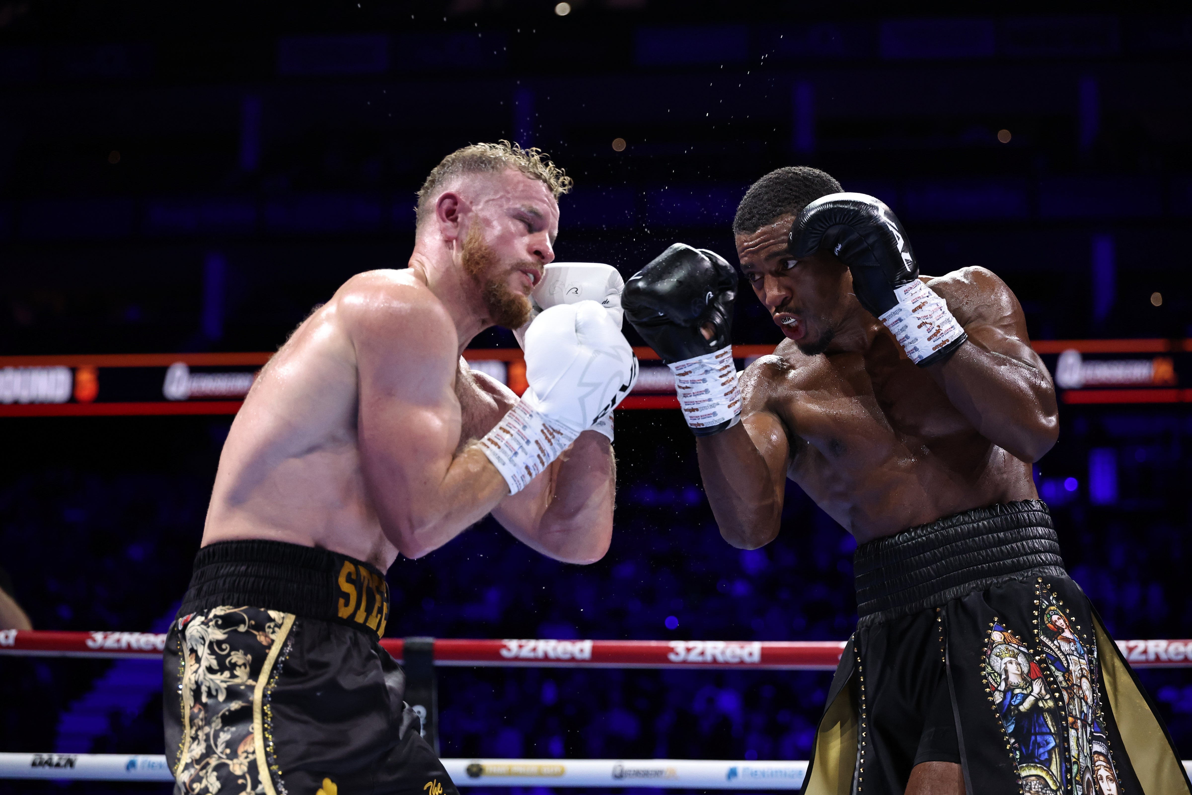 Already wobbled from one assault, Taylor lands another uppercut on the chin of Woodall midway through the round.