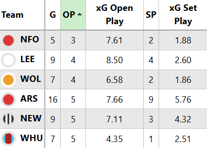 Above: Premier League teams sorted by fewest goals from open play (OP), with their set-piece goals (SP) for comparison