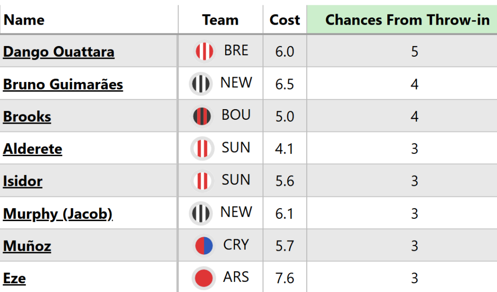 For long throws, this is tricky. While some teams utilise a specialist from both sides, most of the time, the productivity of a long throw stems from the chaotic pinball of second and third balls, which creates a greater degree of randomness. Some teams have consistently targeted players for a near-post flick on (Nathan Collins (£4.9m), Gabriel Magalhaes (£6.5m), Dan Burn (£5.1m)); perhaps these players are best placed to profit from an assist.
