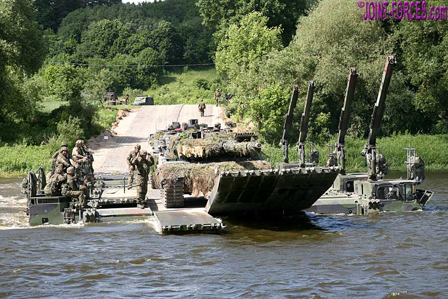 Four linked German and British Army M3 rigs ferry main battle tanks over a river in Lithuania [© Bob Morrison]
