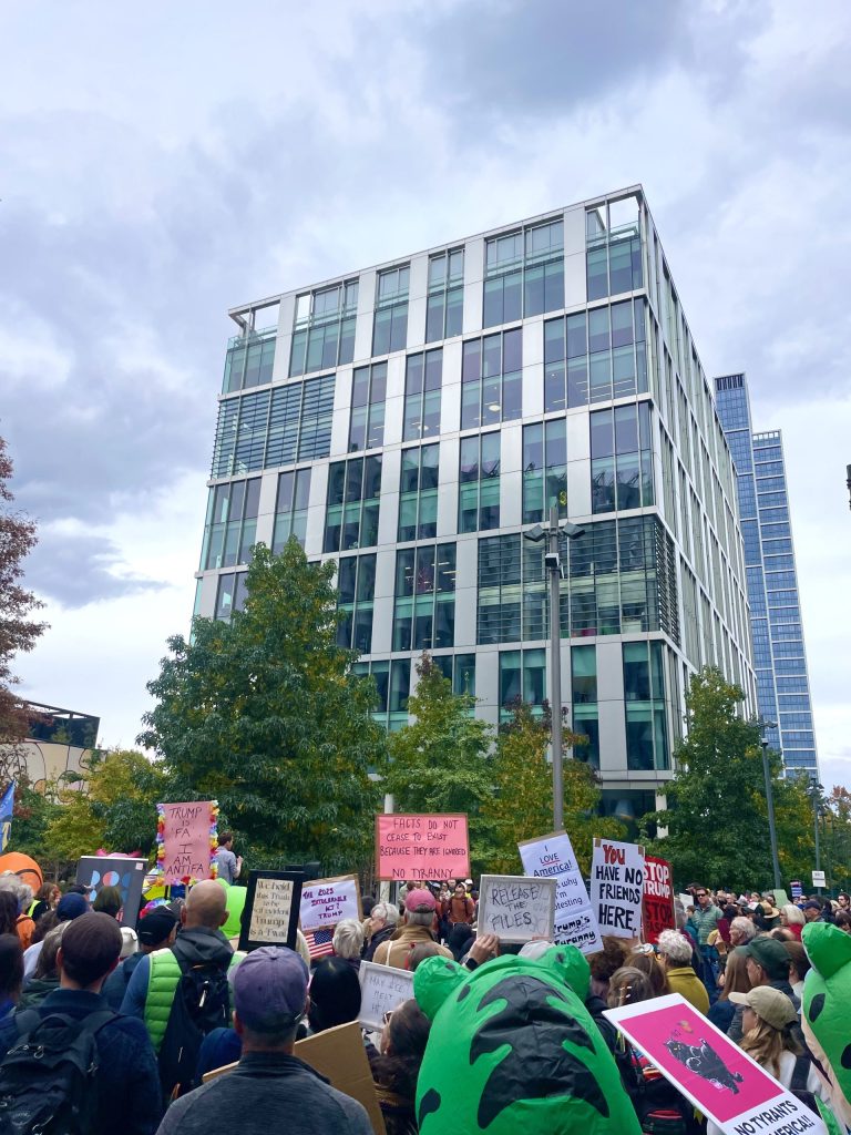Hundreds gathered outside the US Embassy in Nine Elms on Saturday, 18 October, to join the ‘No Kings’ protests, which took place across all 50 US states, and the crowd was overwhelmingly American.