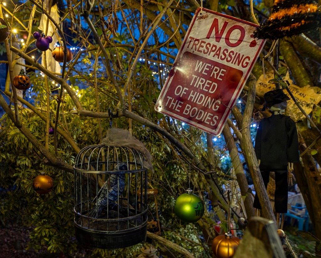Visitors are met with a sign reading “No trespassing, we’re tired of hiding the bodies”.