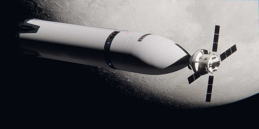 An artist’s rendering of the Human Landing System version of Starship docking with NASA’s Orion spacecraft in lunar orbit. Graphic: SpaceX