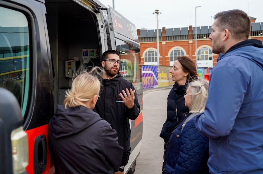 It’s a crisp autumn evening in Ashton-under-Lyne and, instead of the usual clusters of bored teens outside the precinct, something else is parked up and drawing a crowd: a sleek van humming with energy, laughter, and the unmistakable sound of FIFA celebrations.