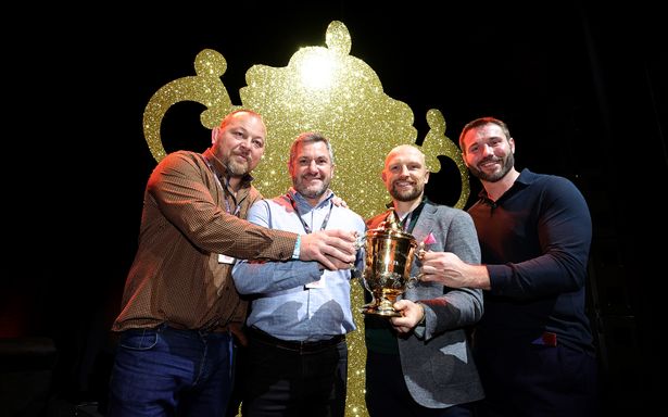 LONDON, ENGLAND – NOVEMBER 22: Former Northampton Saints players (L-R) Steve Thompson, Paul Grayson, Matt Dawson and Ben Cohen pose with the Webb Ellis trophy during the 2003 England Rugby World Cup winning squad reunion at the Eventim Apollo on November 22, 2023 in London, England. (Photo by David Rogers/Getty Images)