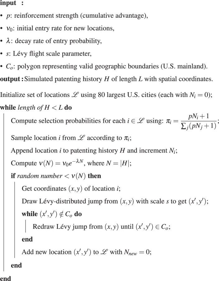 The simulation unfolds over a geographic domain corresponding to the continental United States. It is initialized with the locations of the 80 most populous U.S. cities (population > 500,000), which act as potential starting points for innovation. At each time step, a new patent is added to the system. With some probability, the patent is assigned to an existing location i drawn from the current set \({\mathcal{L}}\) of active locations. The selection probability is given by a reinforcement mechanism: