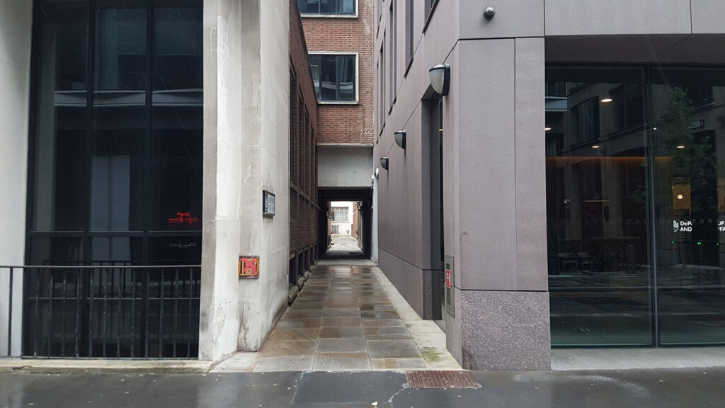 It turns out that the alley was culverted for a couple of decades as a large 1950s building, known as Oyez House, which housed the printing works, storage, and offices for the Solicitors’ Law Stationery Society swallowed up the whole site.