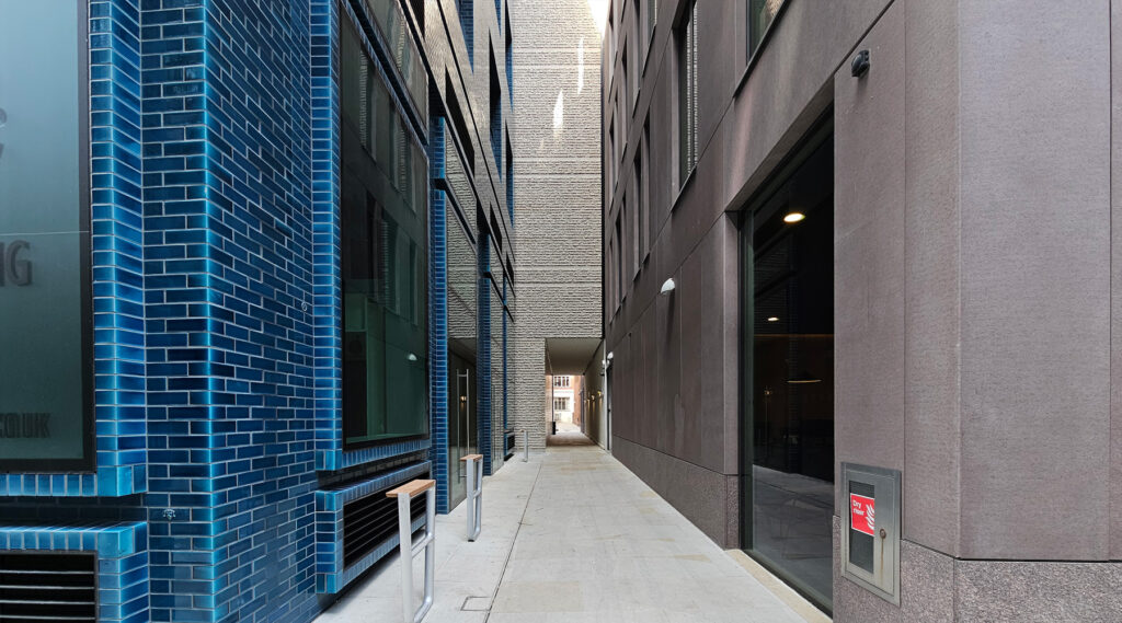 The northern side was rebuilt some years ago, but the southern side was still the 1950s office block until a couple of years ago. It’s since been demolished and replaced with a modern office building, thereby enhancing the alley as well.
