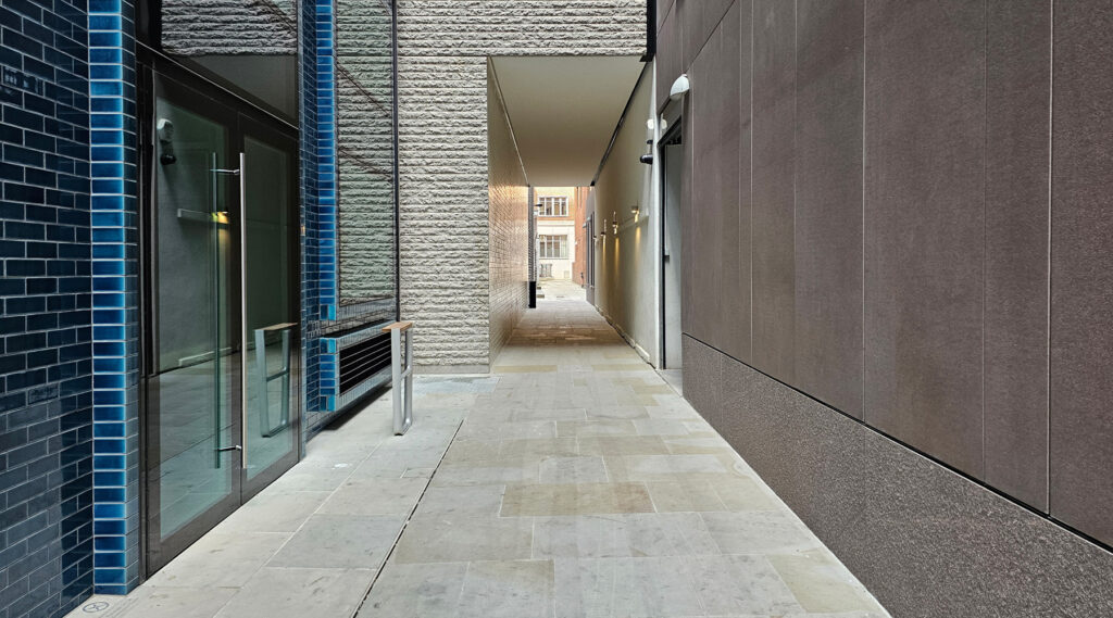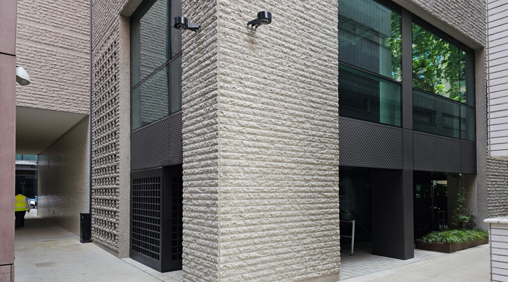 Further down the alley away from the pub and into the office proper, they’ve clad the building in a modern interpretation of rusticated stucco, and here’s a very nice detail in one section of wall that conceals a ventilation wall for the cycle store inside the building.