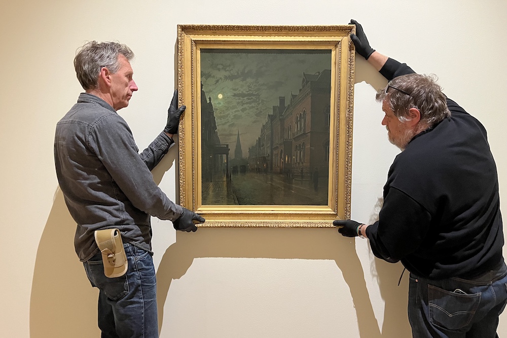 Photo: Technicians at Leeds Art Gallery hang John Atkinson Grimshaw’s famous depiction of Park Row in Leeds