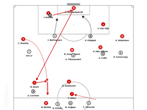 6th minute: Huijsen exploits Ekitiké’s diagonal run to access Tchaouméni, who feeds Carreras near the flanks. Real Madrid’s left back misses his pass toward Vinicius Junior, who moves deeper; however, Bradley’s clearance goes back to Carreras. The latter clips the ball to Vinicius in a one-on-one against Konaté. Bradley immediately recovers to double up on the Brazilian winger.