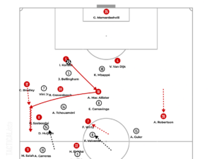 In a medium block, Real Madrid’s fullbacks operated close to the center-backs, attempting to shift Liverpool’s defensive unit across. Meanwhile, Bellingham pinned Bradley on the left inside channel to free Vinicius Junior to receive Valverde’s switch. Gravenberch shifted to provide support to Bradley, which freed Bellingham inside the box to collect Vinicius Junior’s pass and dribble past Konaté to fire a shot into Mamardashvili’s body.
