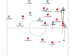Five minutes later, Gravenberch moved behind Real Madrid’s first line of the press to unlock the passing lane between him and Bradley. Tchouaméni shifted across to monitor Wirtz on the right side, with Camavinga jumping onto Mac Allister. As a consequence, Szoboszlai remained free between the lines, whereas Ekitiké had room between the visitors’ double pivots to drop in and receive Gravenberch’s diagonal pass. Ekitiké threaded with Wirtz in a one-two combination, allowing him to scamper forward and find Salah on the right at the edge of the box. Militão cleared Salah’s inswinging cross away.