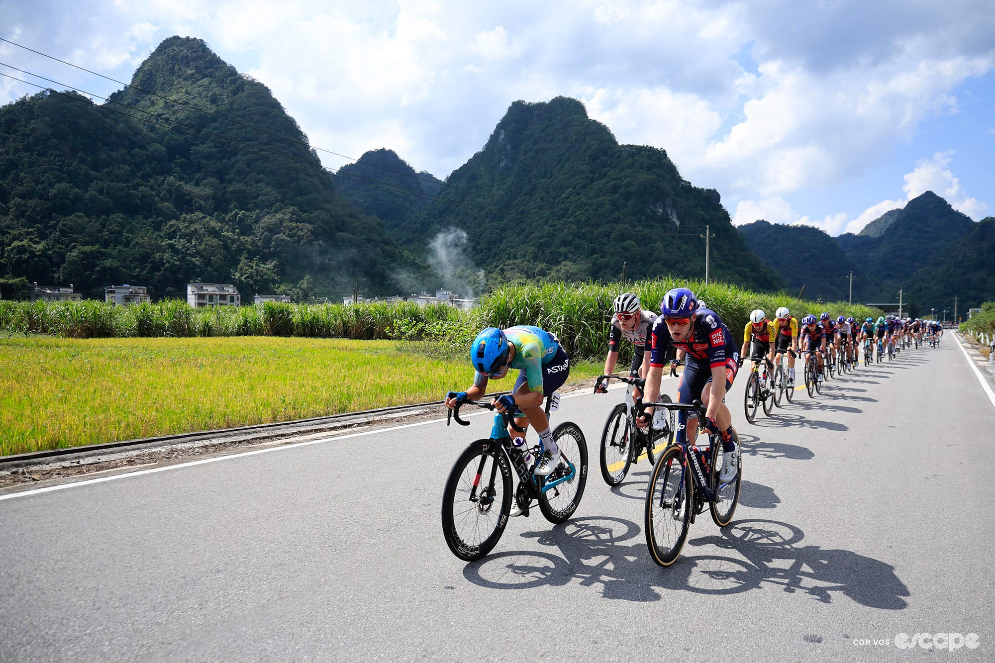 Bike races contain all of the above but at Guangxi the latter side is pulled more into focus. It’s at the gritty end of the spectrum. Team buses are nowhere to be found and instead of hiding behind tinted windows the riders crouch on stools beneath branded marquees pulling on jerseys and attaching race radios, while dead-eyed soigneurs slather the skinny boys in suncream and locals look on in bemusement.