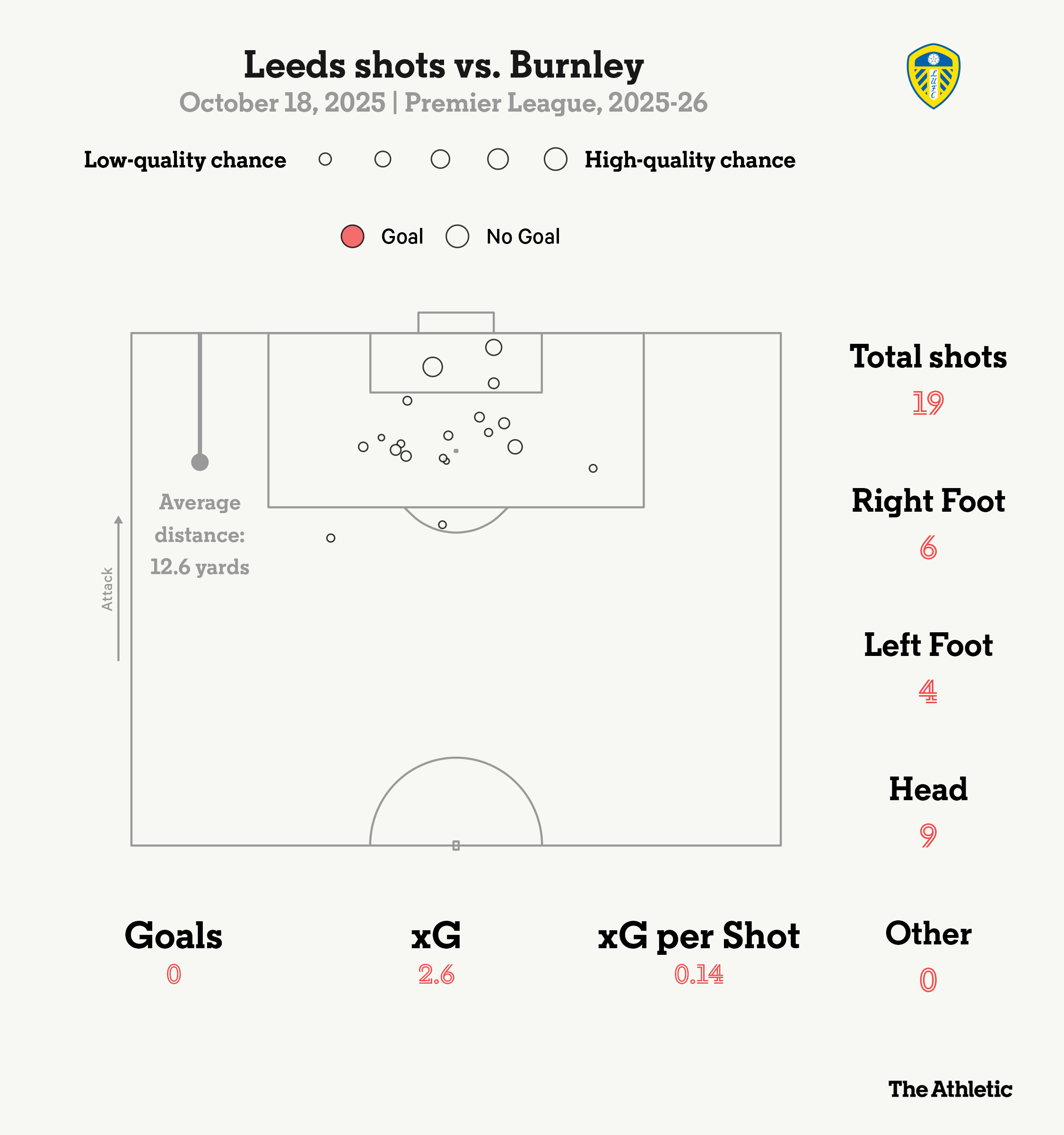 There are crumbs of comfort for Leeds on the road. Four blanks from five is a damning concern, but the overall quantity and quality of chances being created do currently tally with a bottom-five club, which they are.