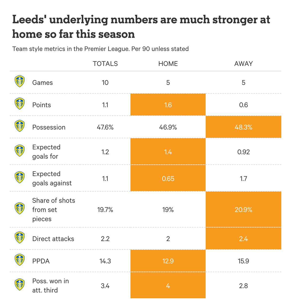 Leeds have produced 1.6 points per match at home versus 0.6 per match away, but there has strangely been marginally more possession for them on the road.