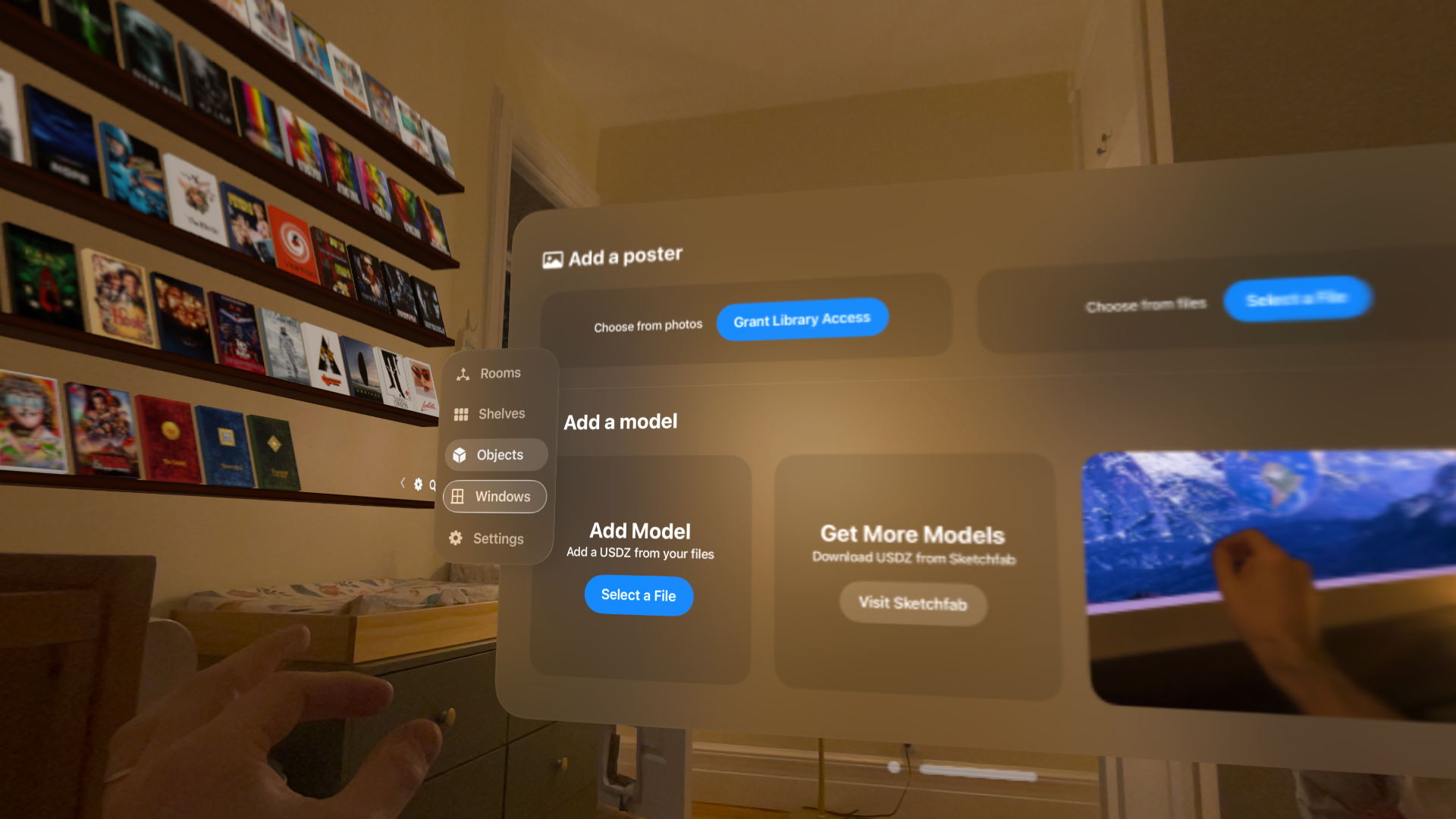ReelRoom is one of the first apps I’ve seen to utilize window management really effectively inside visionOS. Selecting movies, changing the parameters of a shelf and getting it positioned just right in space is all fairly straightforward. You can customize the number of rows and columns in a shelf and remove the backing so you can see the wall behind it. One of my favorite features is an infinite shelf which cuts slits in your floor and ceiling to display a very large collection of movies using the illusion of space you do not have.