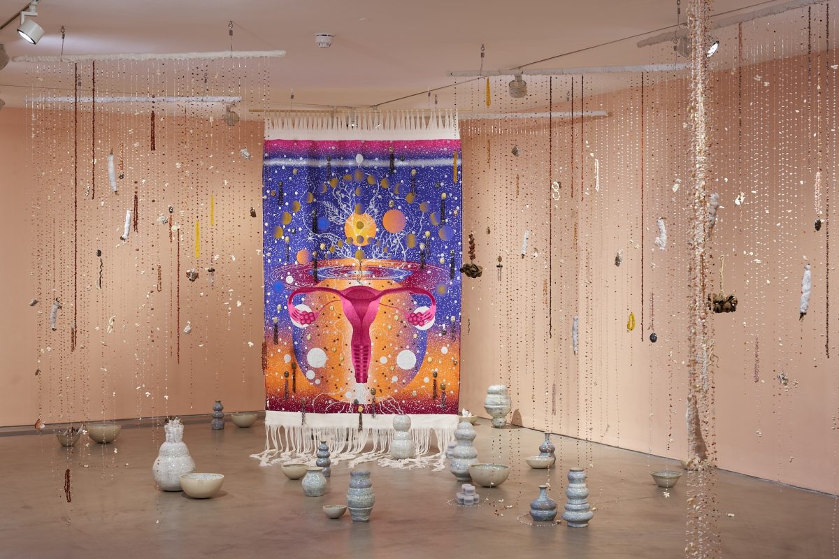 A cosmic textile artwork with a uterus at its centre, ceramic vessels on the floor and lines of beads hanging from the ceiling. Adapting traditions from her Creole heritage and reflecting on stories of intergenerational trauma she has created immersive installations that allow us to step in her world that brings together then natural and man-made worlds. Until 14th December.