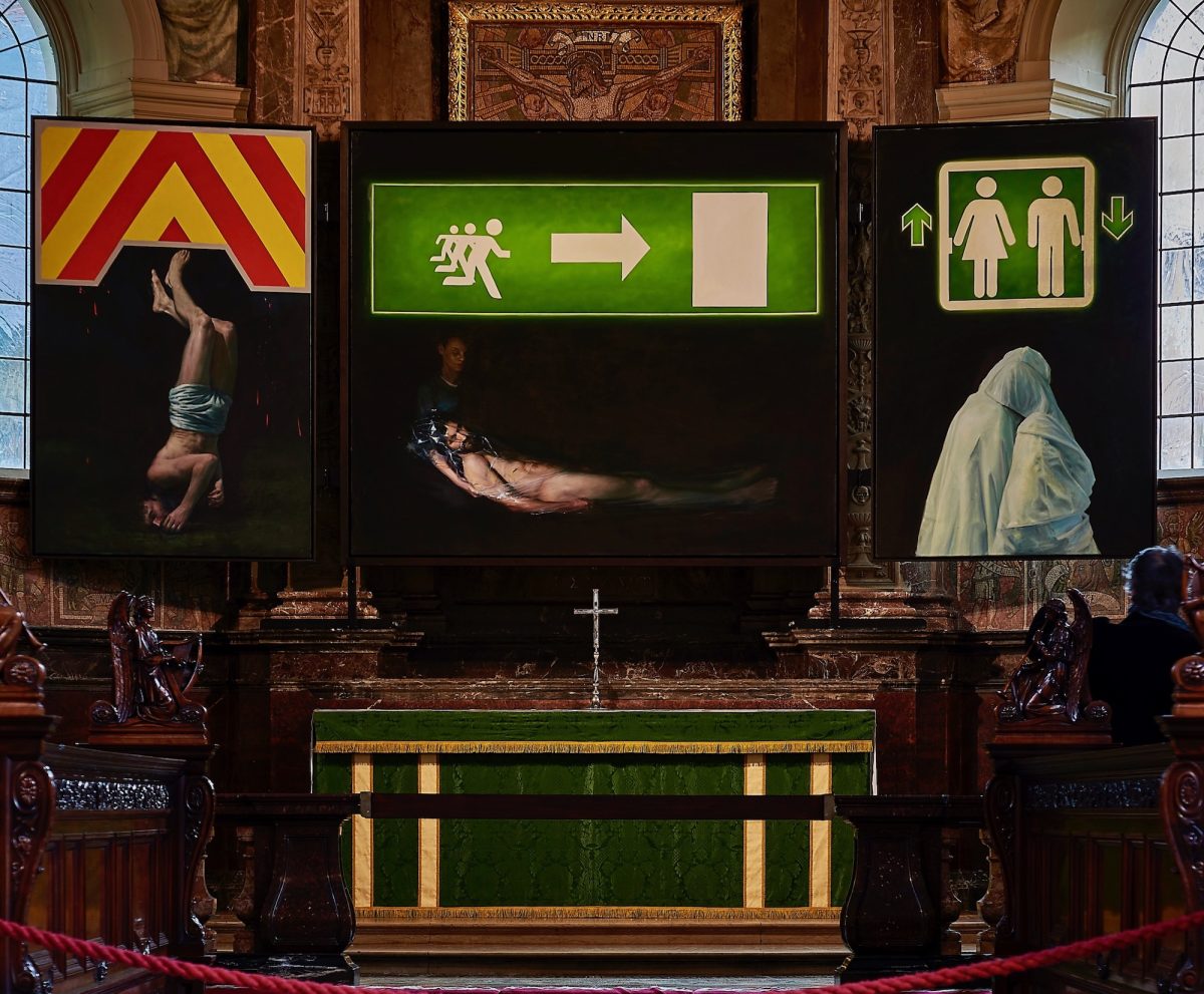 How do you give the traditional church triptych altarpiece a contemporary twist? Paul Benney has painted the traditional religious motifs of the descent from the cross, the entombment of Christ, and mourning figures and placed them alongside illuminated signs from modern society such as those for a lift or emergency exit. The title of the exhibition is based on a Blade Runner quote and there is something sci-fi about these paintings behind a a series that shows a candle slowly burning down to nothing. Until 19th November.