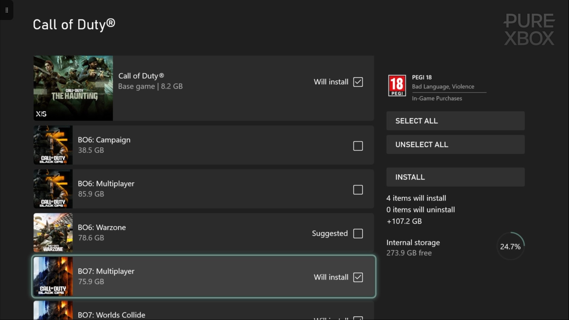 The Black Ops 7 install size for Xbox Series X|S is roughly 107GB with everything installed (this may vary slightly depending on Series X or S). That size can be made slightly smaller if you only want to play a specific portion of the game, but due to the way these file sizes are adding up, you only save a little bit of space by just installing multiplayer, for instance.